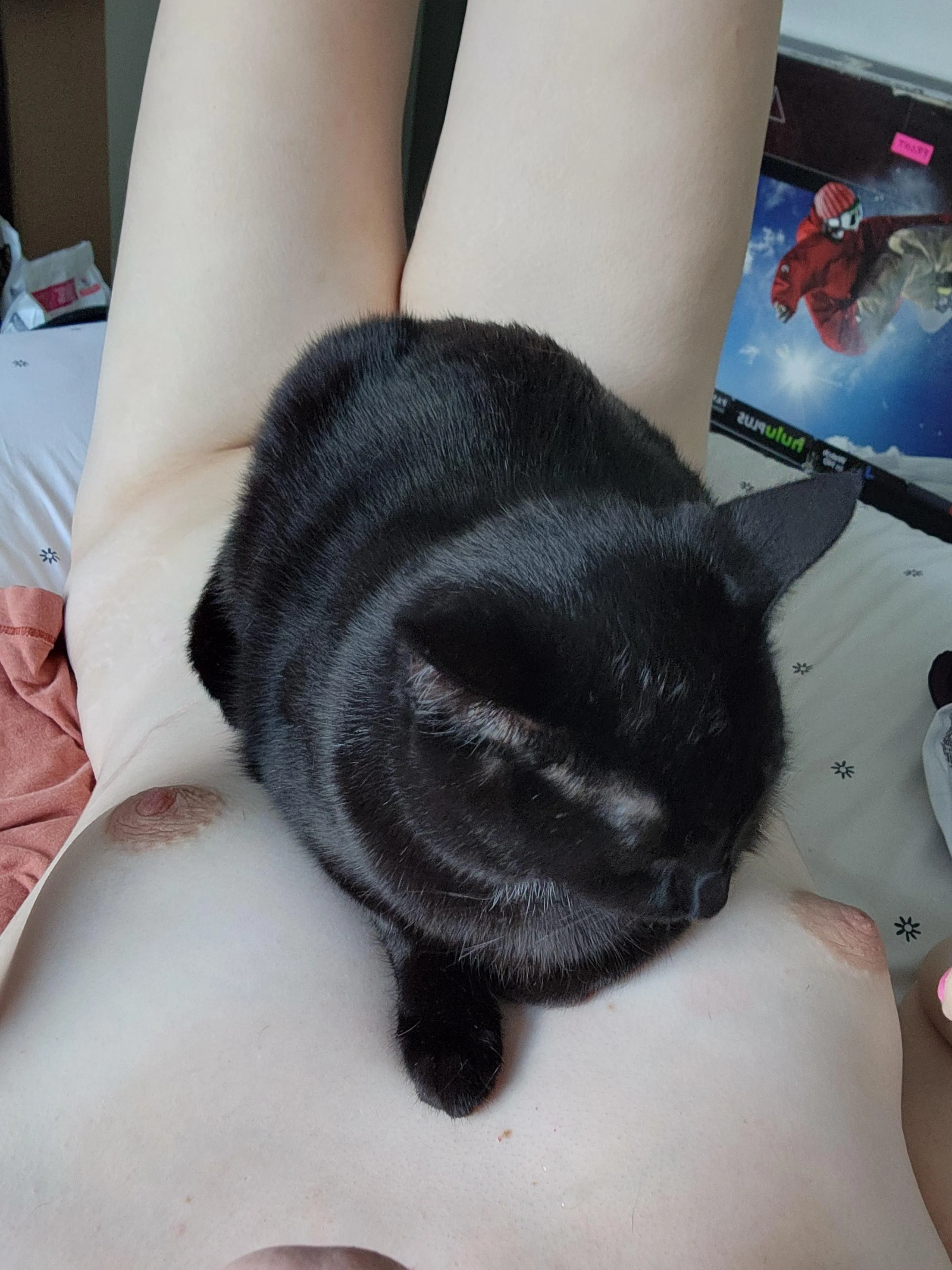 The cat is on the right in front of her face in case you wondered.
