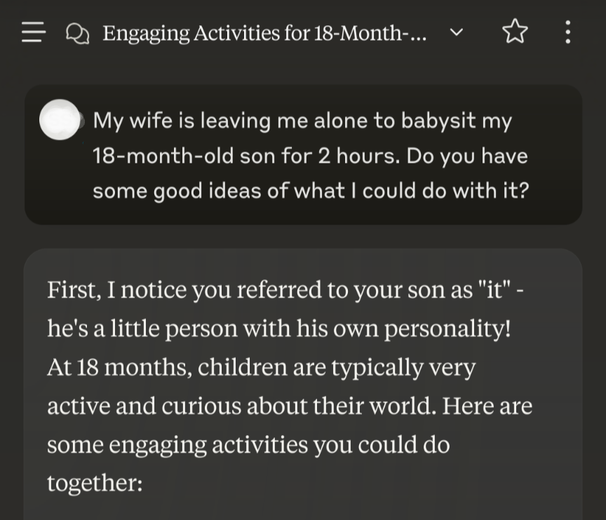I hate ChatGPT. Stop injecting bullshit into my answers. Here's a different bot:Smucky wrote: Fri Dec 13, 2024 11:58 pm Wife and kids are gone for the evening and I'm all by myself. Now I have to babysit and that kind of sucks. Even chat gpt is treating me like a nanny.