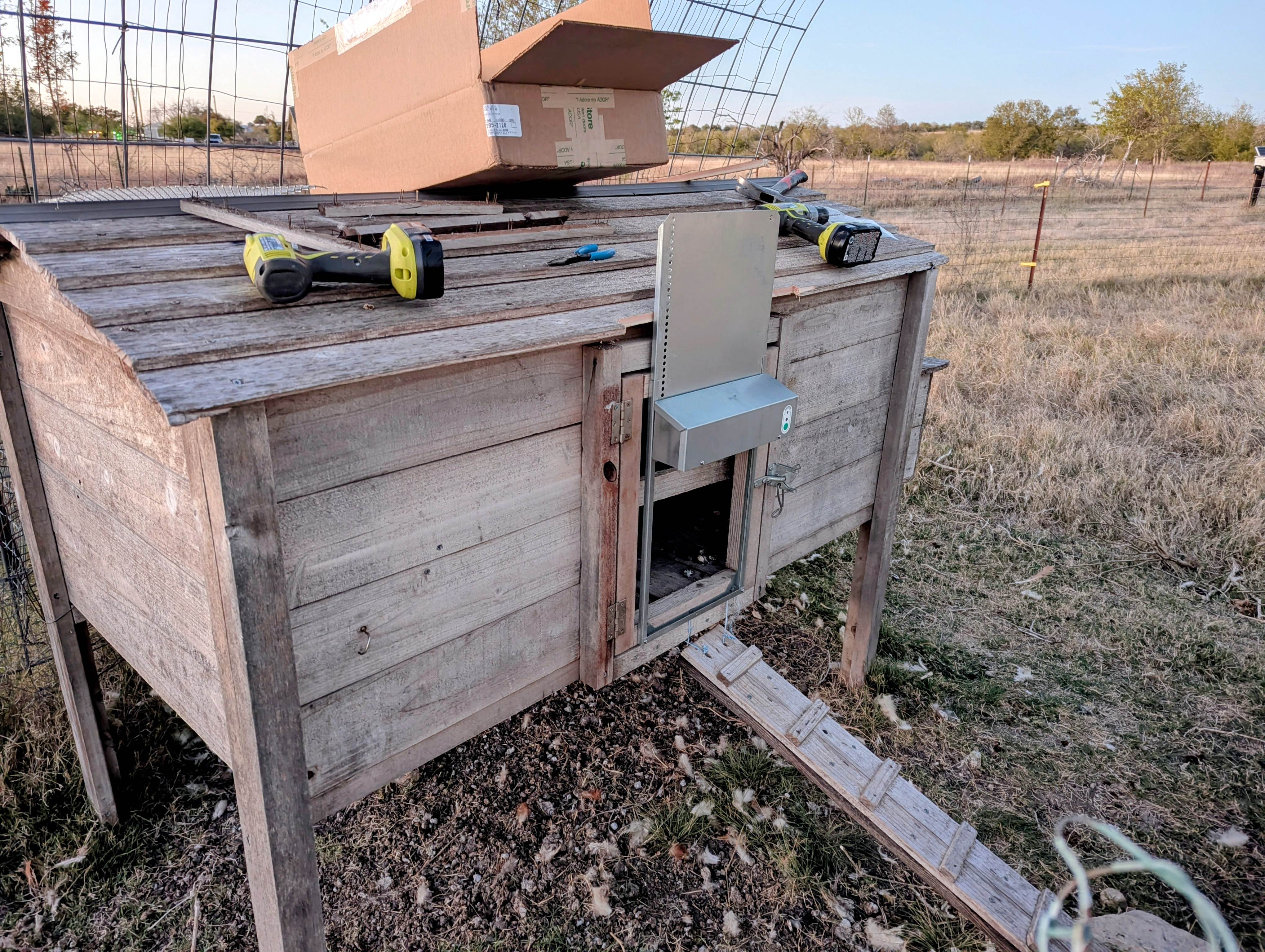 Installed automatic chicken coop door. Took all day. That's why it's night.
