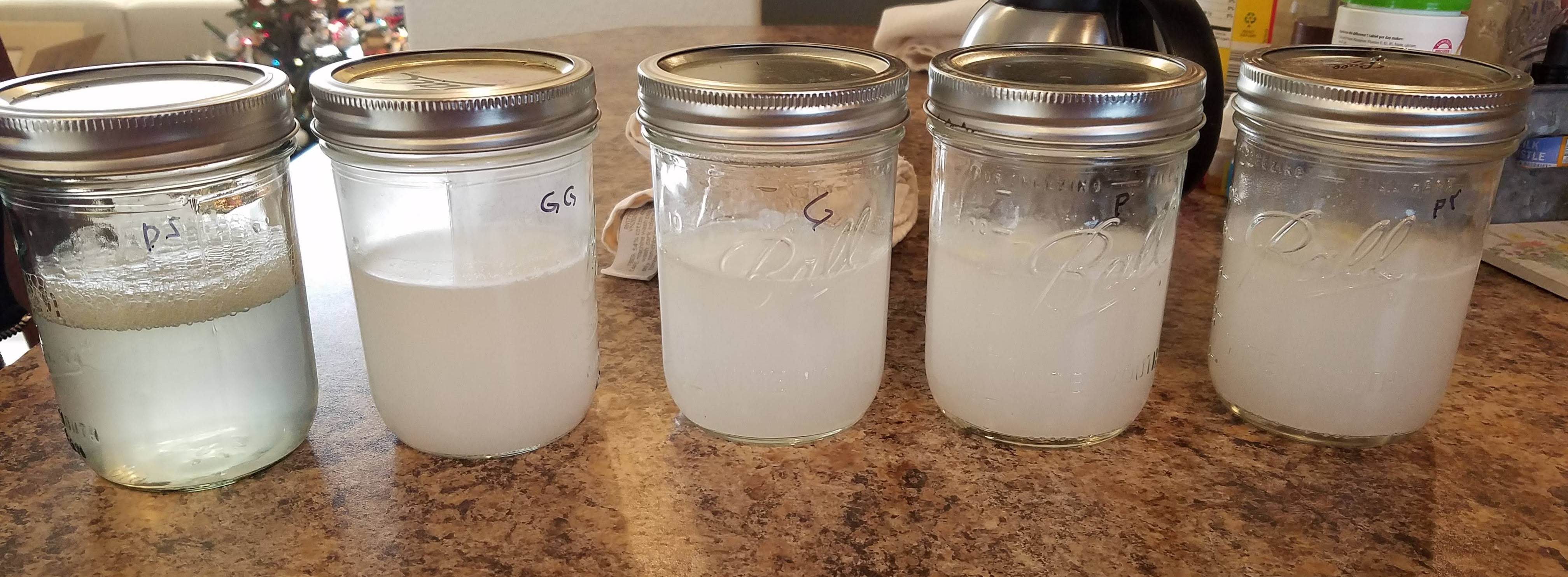 The far left jar just got two drops of regular dish soap. As you can see, that completely emulsifies any fat/oil. The next two jars just had a couple of drop of some dishwasher "gel" soap that my wife swears works best. The next two were cascade powder, with the far right being cascade powder + a bit of sodium tripolyphosphate but that seemed to make no difference. Then I gave the jars a good shake.