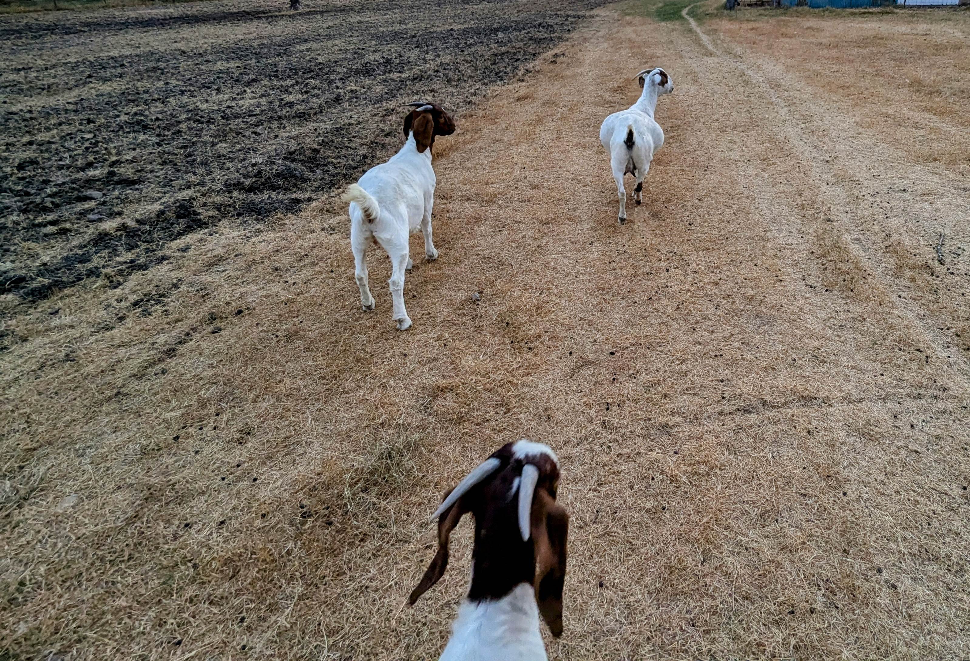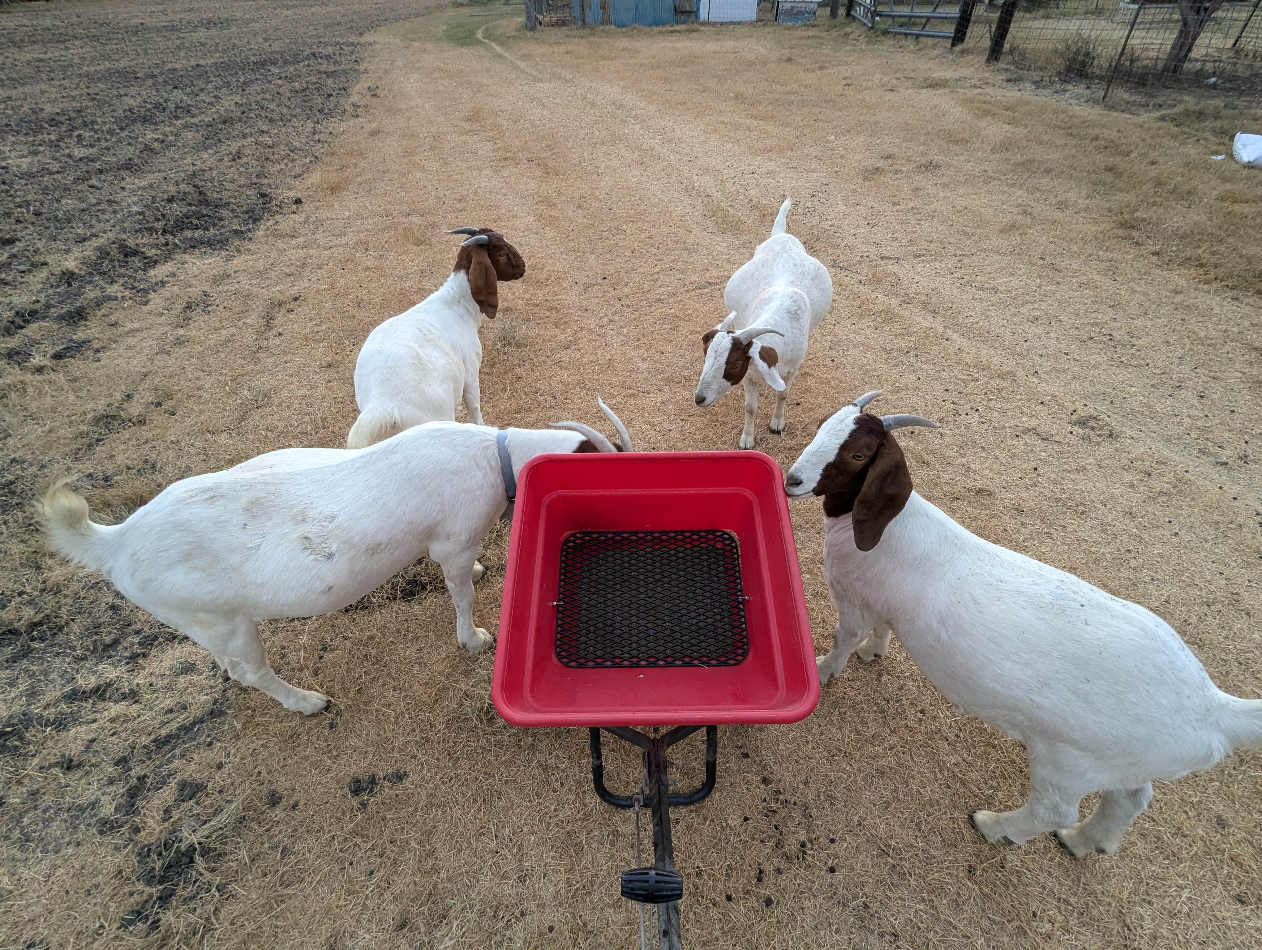 Hasn't rained around here in a couple months. Grass is all dead. So having to throw the goats hay. And hay really bloats em up