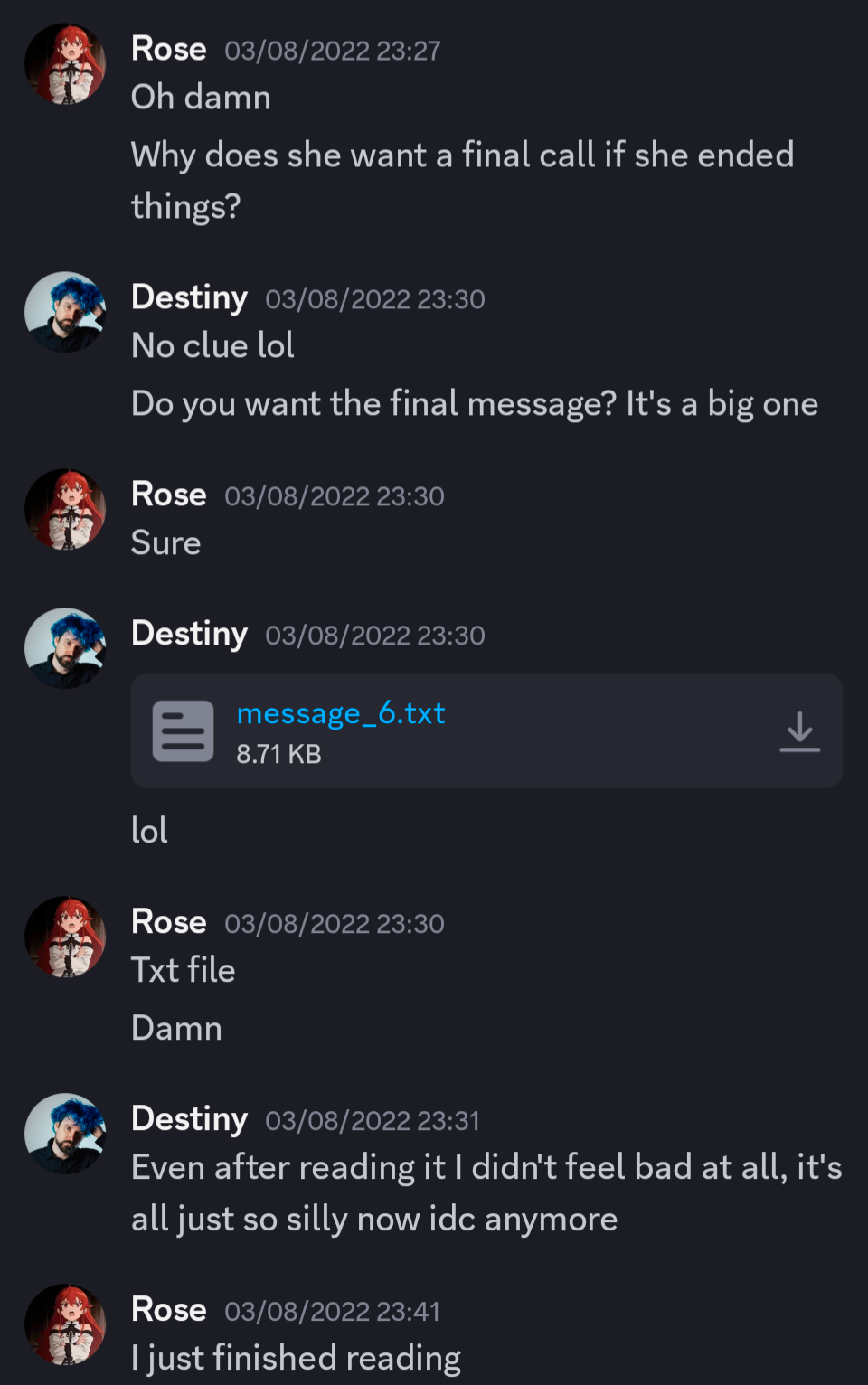 The selfish part of me wants to continue on romantically with you, the part of me that knows what’s right and just certainly towards John is that we need to stop having romantic interactions even just through text. If we don’t any more chaos or pain caused going forward will be entirely my fault for once again ignoring what I know to be the decent thing to do.
